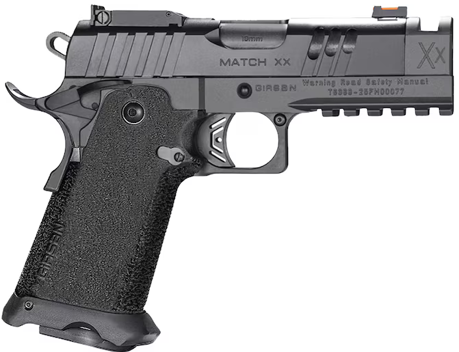 Girsan Witness 2311 Match X 10mm Auto Pistol For Sale. The Girsan Witness2311 Match X is a full-size, lightweight double-stack 1911 chambered in 9mm, designed to deliver performance and value. It features an integrated barrel compensator that effectively reduces felt recoil, providing shooters with greater control and accuracy. Its fully adjustable, serrated rear sight- blacked out for better focus-pairs seamlessly with a fiber optic front sight for fast alignment and quick target acquisition.