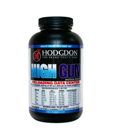 Hodgdon High Gun Smokeless Gun Powder For Sale. The Hodgdon High Gun is a flattened, spherical shotshell powder designed for light target, handicap and super handicap loads in a 12 gauge shotgun. This powder also closely duplicates Remington Nitro 27 factory loads. High Gun’s geometry results in a powder that meters consistently, has excellent ignition and burns clean enough to throw uniform patterns clay after clay.
