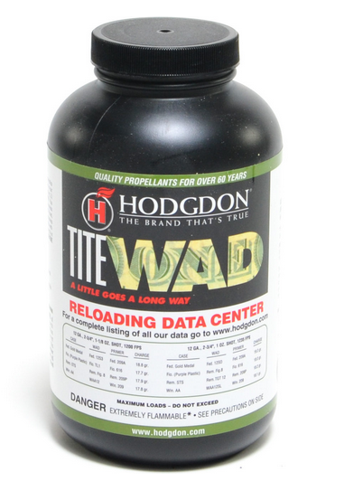 Hodgdon Titewad Smokeless Gun Powder For Sale. Through advanced technology, Hodgdon Powder Co. has produced a superior flattened spherical shotgun powder. Unlike spherical propellants in the past, TITEWAD features low charge weights, mild muzzle report, minimum recoil and reduced residue for optimum ballistic performance. This outstanding propellant, designed for 12 gauge only, meters superbly and is ideal for 7/8, 1 and 1-1/18 ounce loads. As the name implies, a little