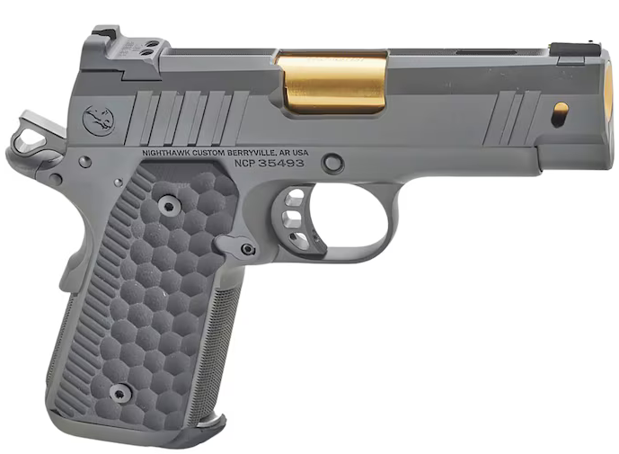 Nighthawk Custom Treasurer 9mm Luger Pistol For Sale. The Treasurer is the fourth installment in Nighthawk’s Boardroom Series of 1911 pistols. The Treasurer is a 9mm pistol built on an officer frame and features a 3.8″ bull barrel. The heavy angle cuts in the slide aid in faster cycling for competitive shooters while windows show off the Gold Titanium Nitride crowned barrel. This pistol has a Heinie Black Ledge rear sight with a 14k gold bead front sight.