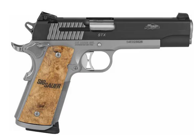 Sig Sauer 1911 STX Massachusetts Compliant Pistol For Sale. This non-railed pistol features a Nitron slide over a natural stainless frame and is accented by beautiful custom wood grips. The slide is further accented by polished cocking serrations and a flat top which enhances the two-tone aspect of this pistol. The slide is topped off with adjustable combat night sights while the frame is outfitted with a magwell for fast smooth reloads.