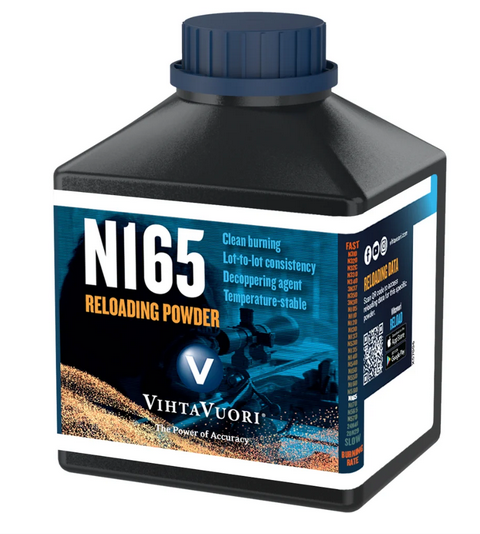 Vihtavuori N165 Smokeless Gun Powder For Sale. The N165 rifle powder by Vihtavuori is an extremely versatile powder for magnum rifle calibers and is exceptional for long-range applications. This very slow-burning powder fires at higher velocities. You can count on N165 as a great choice when hunting big game or shooting long-range targets.